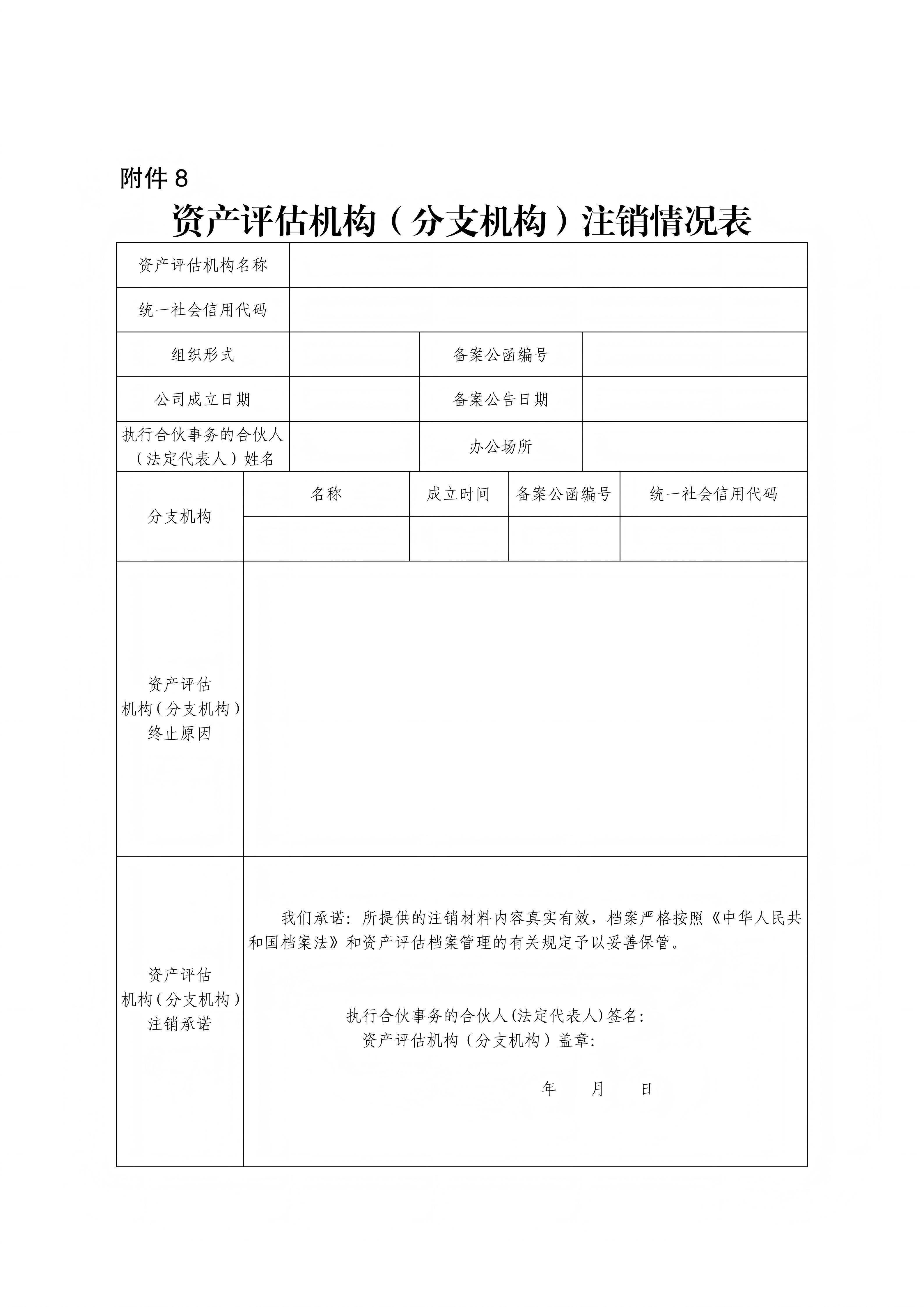 2.《资产评估机构(分支机构)注销情况表》(附件8);