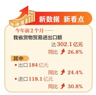 3月13日,太原海关发布最新统计数据,今年前2个月,我省货物贸易进出口额达302.1亿元,同比增长26.8%。其中,出口184亿元,同比增长24.4%;进口118.1亿元,同比增长30.8%。
