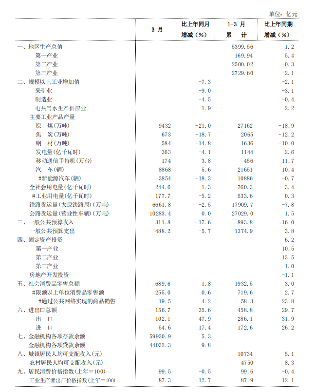 2024年一季度全省主要经济指标完成情况