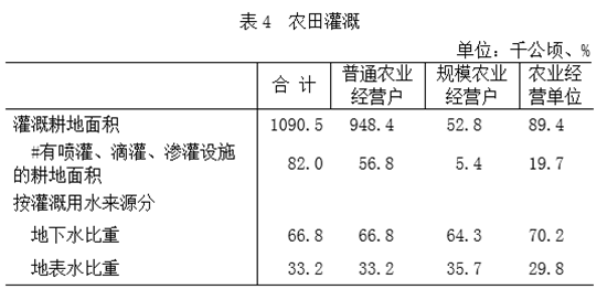 2016年末,全省灌溉耕地面积1090.5千公顷,其中有喷灌、滴灌、渗灌设施的耕地面积82.0千公顷;灌溉用水主要水源中,使用地下水的户和农业生产单位占66.8%,使用地表水的户和农业生产单位占33.2%。