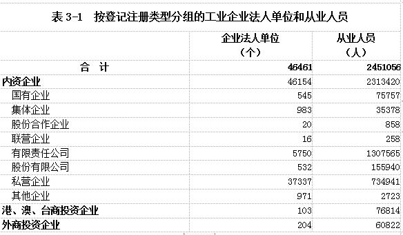在工业企业法人单位中,内资企业46154个,占99.34%;港、澳、台商投资企业103个,占0.22%;外商投资企业204个,占0.44%。内资企业中,国有企业545个,占全部企业的1.17%;集体企业983个,占2.12%;私营企业37337个,占80.36%。