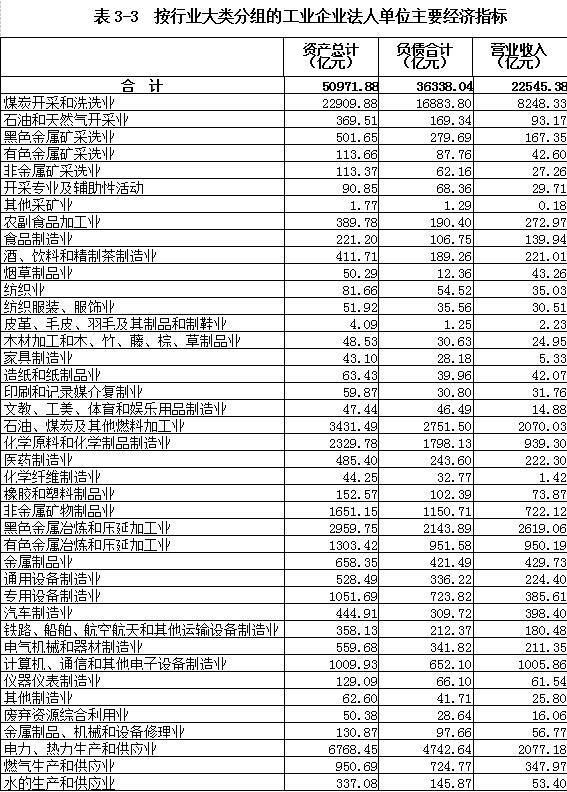在工业企业法人单位从业人员中,采矿业占43.45%,制造业占49.97%,电力、热力、燃气及水生产和供应业占6.58%。在工业行业大类中,煤炭开采和洗选业、非金属矿物制品业、黑色金属冶炼和压延加工业从业人员数位居前三位,分别占41.11%、6.29%和5.55%(详见表3-2)。