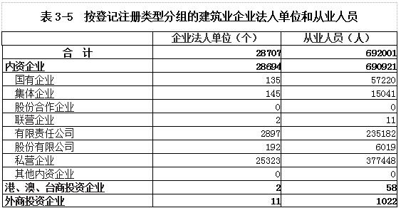 建筑业企业法人单位从业人员69.20万人,内资企业占99.84%。其中,国有企业占内资企业的8.28%,集体企业占2.18%,私营企业占54.63%(详见表3-5)。