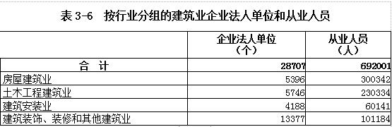 建筑业企业法人单位从业人员中,房屋建筑业占43.40%,土木工程建筑业占33.29%,建筑安装业占8.69%,建筑装饰、装修和其他建筑业占14.62%(详见表3-6)。