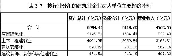 2018年末,建筑业企业法人单位资产总计6964.44亿元,比2013年末增长89.54%。负债合计5118.62亿元。全年实现营业收入4762.77亿元(详见表3-7)。