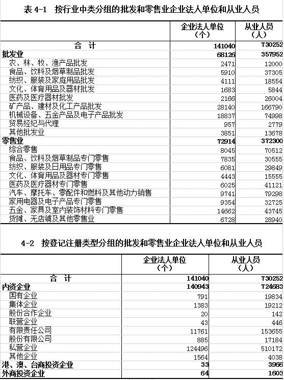 在批发和零售业企业法人单位从业人员中,内资企业占99.24%,港、澳、台商投资企业占0.54%,外商投资企业占0.22%(详见表4-2)。