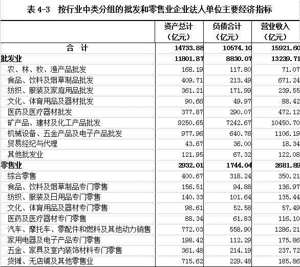 2018年末,批发和零售业企业法人单位资产总计14733.88亿元,比2013年末增长70.92%。其中,批发业企业法人单位资产总计11801.87亿元,零售业企业法人单位资产总计2932.01亿元,分别比2013年末增长79.13%和44.30%。负债合计10574.10亿元。全年实现营业收入15921.60亿元(详见表4-3)。