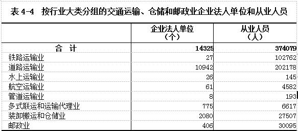 2018年末,全省共有交通运输、仓储和邮政业企业法人单位14325个,从业人员37.41万人,分别比2013年末增长185.76%和22.49%(详见表4-4)。