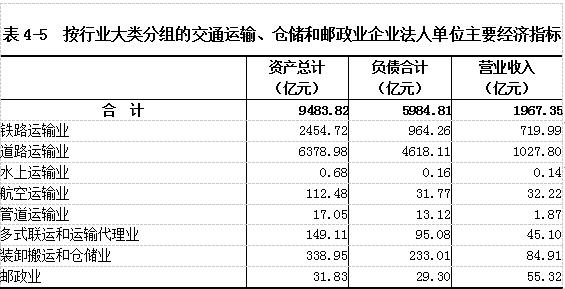 2018年末,交通运输、仓储和邮政业企业法人单位资产总计9483.82亿元,比2013年末增长110.17%。负债合计5984.81 亿元。全年实现营业收入1976.35 亿元(详见表4-5)。
