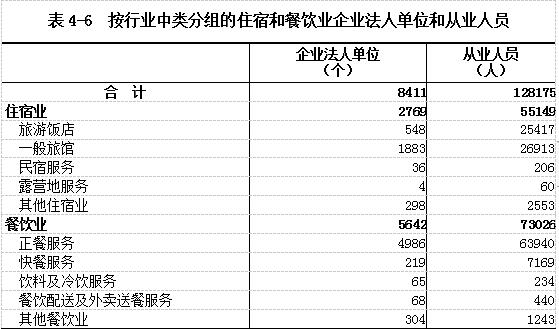 在住宿和餐饮业企业法人单位中,住宿业占32.92%,餐饮业占67.08%。在住宿和餐饮业企业法人单位从业人员中,住宿业占43.03%,餐饮业占56.97%(详见表4-6)。