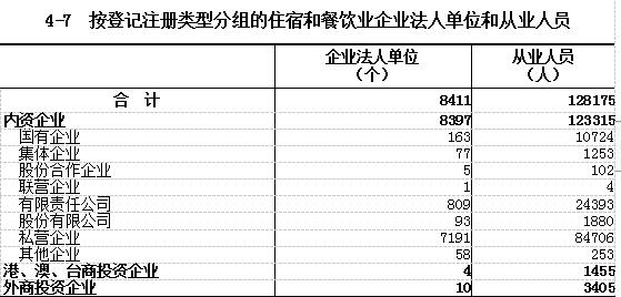 在住宿和餐饮业企业法人单位中,内资企业占99.83%,港、澳、台商投资企业占0.05%,外商投资企业占0.12%。从业人员中,内资企业占96.21%,港、澳、台商投资企业占1.14%,外商投资企业占2.65%(详见表4-7)。