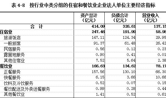 2018年末,住宿和餐饮业企业法人单位资产总计414.09亿元,比2013年末增长3.70%。其中,住宿业企业法人单位资产总计247.46亿元,餐饮业企业法人单位资产总计166.63亿元。负债合计326.61亿元。全年实现年营业收入137.15亿元(详见表4-8)。