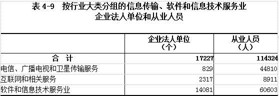 2018年末,全省共有信息传输、软件和信息技术服务业企业法人单位17227个,从业人员11.43万人,分别比2013年末增长970.67%和58.12%(详见表4-9)。