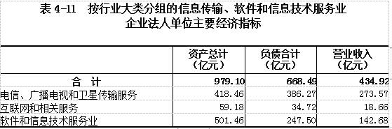 2018年末,信息传输、软件和信息技术服务业企业法人单位资产总计979.10亿元,比2013年末增长51.77%。负债合计668.49亿元。全年实现营业收入434.92亿元(详见表4-11)。