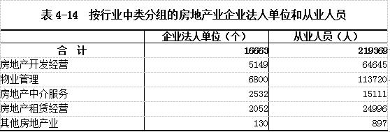 在房地产企业法人单位中,房地产开发经营业占30.90%,物业管理占40.81%,房地产中介服务占15.20%,房地产租赁经营占12.31%。在房地产企业法人单位从业人员中,房地产开发经营业占29.47%,物业管理占51.84%,房地产中介服务占6.89%,房地产租赁经营占11.39%。(详见表4-14)。