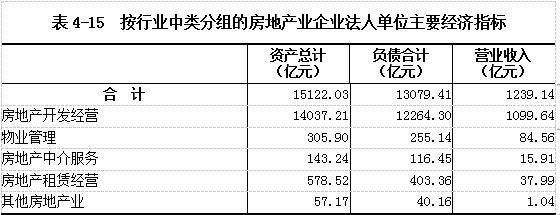 2018年末,全省房地产业企业法人单位的资产总计为15122.03亿元,比2013年末增长161.17%。其中,房地产开发经营企业14037.21亿元,物业管理企业305.90亿元,房地产中介服务企业143.24亿元,分别比2013年末增长163.16%,174.89%和439.70%。负债合计13079.41亿元。全年实现营业收入1239.14亿元(详见表4-15)。