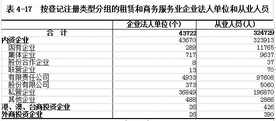 在租赁和商务服务业企业法人单位从业人员中,内资企业占99.75%,港、澳、台商投资企业占0.13%,外商投资企业占0.13%(详见表4-17)。