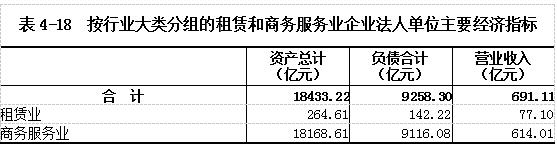 2018年末,租赁和商务服务业企业法人单位资产总计18433.22亿元,比2013年末增长177.97%。其中,租赁业企业法人单位资产总计264.61亿元,商务服务业企业法人单位资产总计18168.61亿元,分别比2013年末增长283.86%和176.86%。负债合计9258.30亿元。全年实现营业收入691.11亿元。(详见表4-18)。