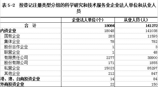 在科学研究和技术服务业企业法人单位从业人员中,内资企业占99.83%,港、澳、台商投资企业占0.06%,外商投资企业占0.11%(详见表5-2)。