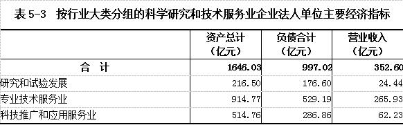 2018年末,科学研究和技术服务业企业法人单位资产总计1646.03亿元,比2013年末增长107.61%。负债合计994.10亿元。全年实现营业收入352.60亿元(详见表5-3)。