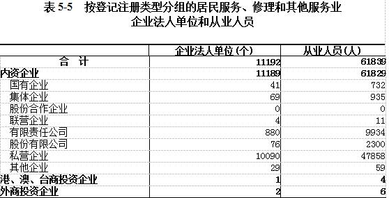 在居民服务、修理和其他服务业企业法人单位从业人员中,内资企业占99.98%,港、澳、台商投资企业占0.01%,外商投资企业占0.01%(详见表5-5)。