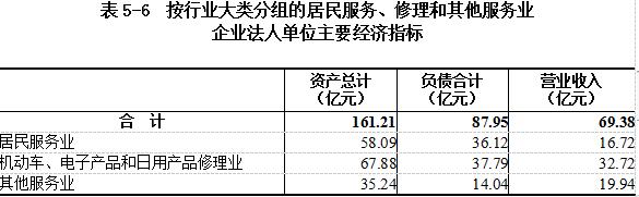 2018年末,居民服务、修理和其他服务业企业法人单位资产总计161.21亿元,比2013年末增长109.78%。负债合计87.95亿元。全年实现营业收入69.38亿元(详见表5-6)。
