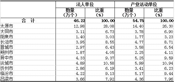 2018年末,在第二产业和第三产业法人单位中,位居前三位的地区是:太原市12.98万个,占28.08%;运城市4.89万个,占10.58%;晋中市4.33万个,占9.37%。