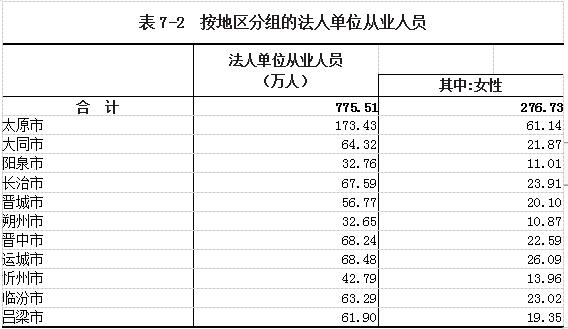 在法人单位从业人员中,位居前三位的地区是:太原市173.43万人,运城市68.48万人,晋中市68.24万人。