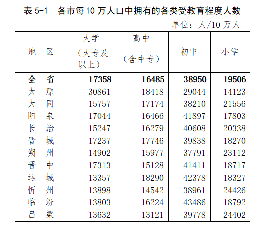 根据山西省第七次全国人口普查结果,现将2020年11月1日零时全省及11个市的常住人口受教育基本情况公布如下:
