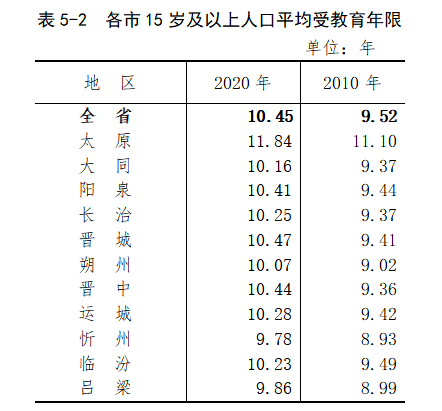 与2010年第六次全国人口普查相比,全省常住人口中,15岁及以上人口的平均受教育年限由9.52年提高至10.45年。