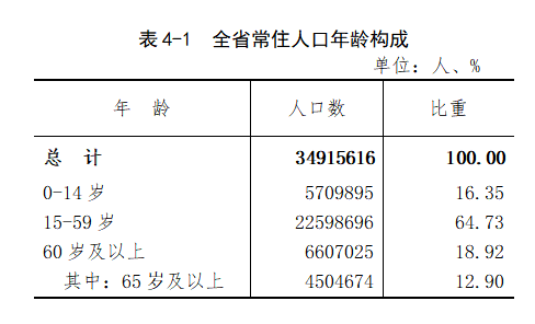 全省常住人口中,0-14岁[2]人口为5709895人,占16.35%;15-59岁人口为22598696人,占64.73%[3];60岁及以上人口为6607025人,占18.92%,其中65岁及以上人口为4504674人,占12.90%。与2010年第六次全国人口普查相比,0-14岁人口的比重下降0.74个百分点,15-59岁人口的比重下降6.65个百分点,60岁及以上人口的比重上升7.39个百分点,65岁及以上人口的比重上升5.33个百分点。