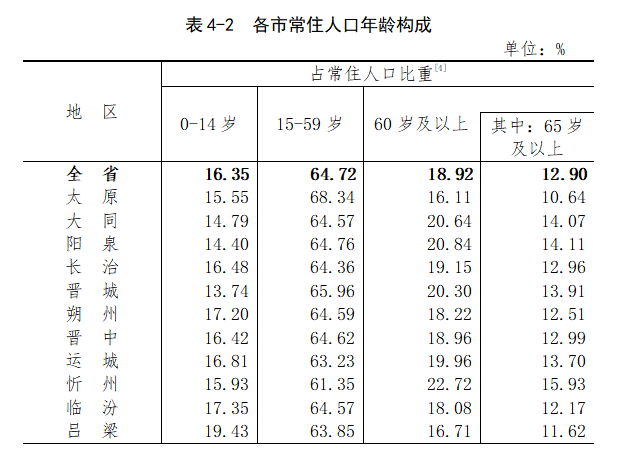 根据山西省第七次全国人口普查结果,现将2020年11月1日零时全省及11个市的常住人口年龄构成情况公布如下: