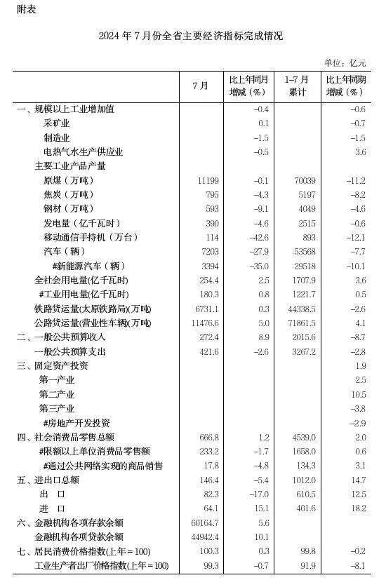 1-7月份,全省规模以上工业增加值同比下降0.6%,降幅较上半年收窄0.4个百分点。从三大门类看,采矿业下降0.7%,制造业下降1.5%,电热气水生产供应业增长3.6%。从煤与非煤看,煤炭工业下降0.2%,非煤工业下降1.5%。7月份,全省规上工业增加值同比下降0.4%,降幅较6月份收窄1.6个百分点。
