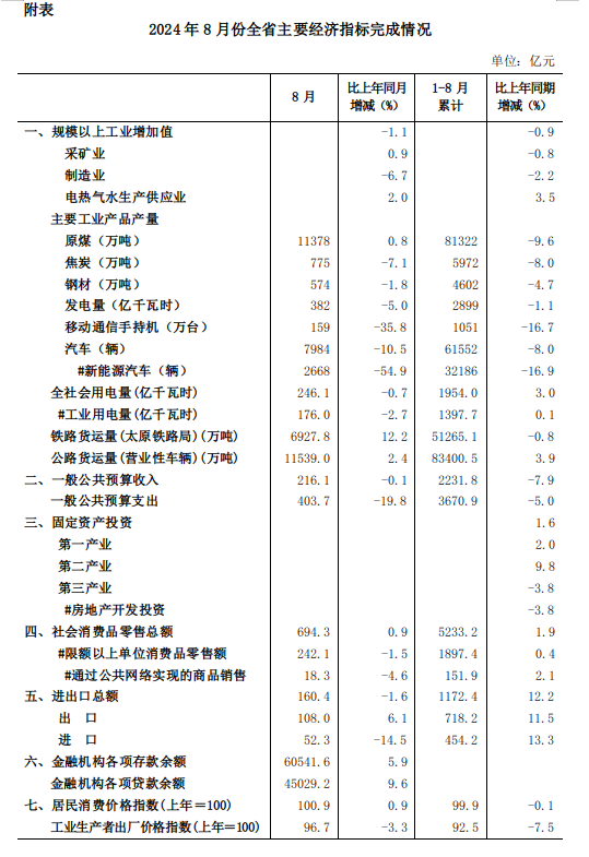 1-8月份,全省规模以上工业增加值同比下降0.9%。从三大门类看,采矿业下降0.8%,制造业下降2.2%,电热气水生产供应业增长3.5%。从煤与非煤看,煤炭工业下降0.3%,非煤工业下降2.2%。8月份,全省规上工业增加值同比下降1.1%。
