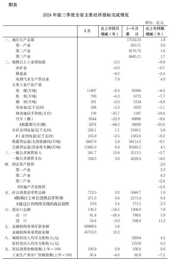 总的来看,前三季度全省经济运行保持稳定恢复态势。尤其是进入三季度以来,随着一系列宏观政策成效逐步显现,部分行业领域呈现积极变化,9月当月,全省固定资产投资增速较8月份由负转正回升4.9个百分点,一般公共预算收入由负转正回升16.0个百分点,限额以上消费品零售额由负转正回升1.9个百分点,其中家用电器和音像器材类零售额加快18.2个百分点。但外部环境复杂严峻,经济稳增长基础尚不牢固。下一步,全省上下要全面贯彻落实党的二十届三中全会精神,按照党中央关于经济工作的决策部署,围绕省委、省政府工作重点,坚定发展信心、积极主动作为,补足短板弱项、增强内生动力,强化存量政策和增量政策协同发力,巩固经济稳定运行、回升向好基础,努力完成全年经济社会发展目标任务。