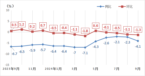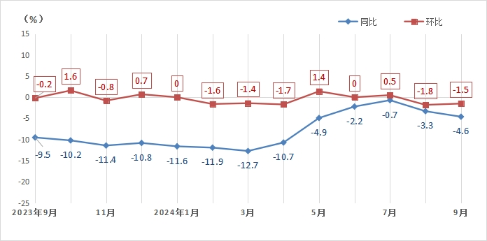 2024年9月份,山西工业生产者出厂价格同比下降4.6%,降幅较上月扩大1.3个百分点;环比下降1.5%,降幅较上月收窄0.3个百分点。工业生产者购进价格同比下降4.1%,降幅较上月扩大1.8个百分点;环比下降1.3%,降幅较上月扩大0.2个百分点。1-9月平均,山西工业生产者出厂价格较上年同期下降7.2%,工业生产者购进价格下降4.7%。