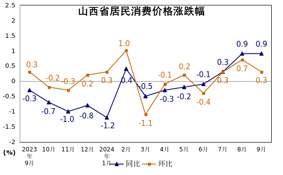 9月份,山西省居民消费价格环比上涨0.3%,涨幅比上月回落0.4个百分点。其中,城市上涨0.3%,农村上涨0.5%;食品价格上涨1.1%,非食品价格上涨0.1%;消费品价格上涨0.6%,服务价格下降0.1%。