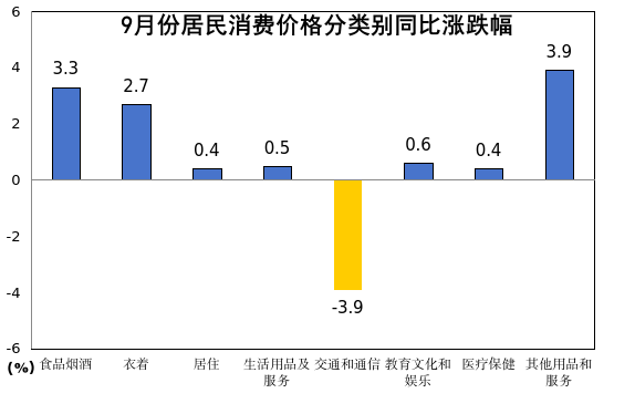 其他七大类价格同比六涨一降。其中,其他用品和服务价格上涨3.9%,衣着价格上涨2.7%,教育文化和娱乐价格上涨0.6%,生活用品及服务价格上涨0.5%,居住价格上涨0.4%,医疗保健价格上涨0.4%;交通和通信价格下降3.9%。