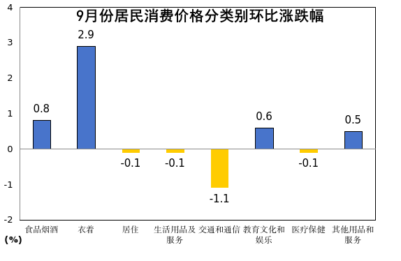 其他七大类价格环比三涨四降。其中,衣着价格上涨2.9%,教育文化和娱乐价格上涨0.6%,其他用品和服务价格上涨0.5%;交通和通信价格下降1.1%,医疗保健价格下降0.1%,居住价格下降0.1%,生活用品及服务价格下降0.1%。