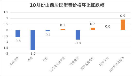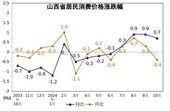 10月份,山西省居民消费价格环比由上月的上涨转为下降0.4%。其中,城市下降0.3%,农村下降0.5%;食品价格下降0.8%,非食品价格下降0.2%;消费品价格下降0.5%,服务价格下降0.1%。