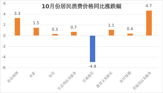 其他七大类价格同比六涨一降。其中,其他用品及服务价格上涨4.7%,衣着价格上涨1.5%,教育文化娱乐价格上涨1.1%,生活用品及服务价格上涨0.7%,医疗保健价格上涨0.4%,居住价格上涨0.3%;交通通信价格下降4.9%。