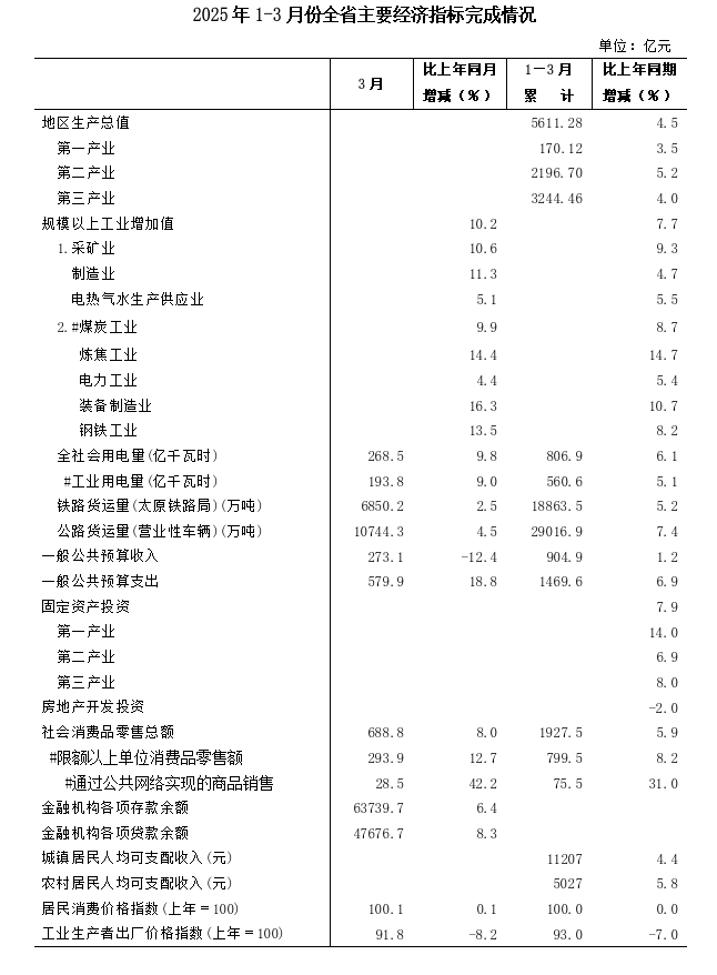 根据地区生产总值统一核算结果,一季度全省地区生产总值为5611.28亿元,按不变价格计算,同比增长4.5%。其中,第一产业增加值为170.12亿元,增长3.5%;第二产业增加值为2196.70亿元,增长5.2%;第三产业增加值为3244.46亿元,增长4.0%。