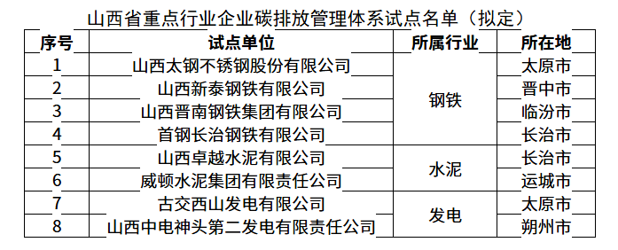 现对山西省重点行业企业碳排放管理体系试点名单(拟定)予以公示,公示期为9月17日至9月23日。公示期间,任何单位和个人对公示信息存有异议的,请以实名书面方式通过邮寄进行反映(以寄出时间为准,公示期结束后寄出的文件不再受理),所提意见要求真实客观,并提供必要的证明材料。