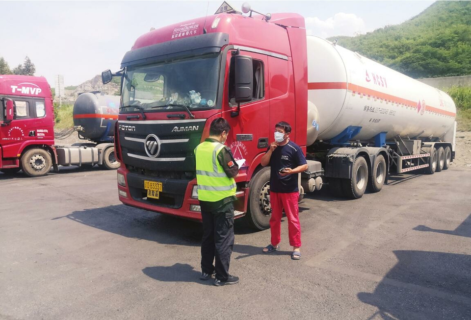 高速公路服务区工作人员对停放的危货车进行登记工作。郝小薇摄