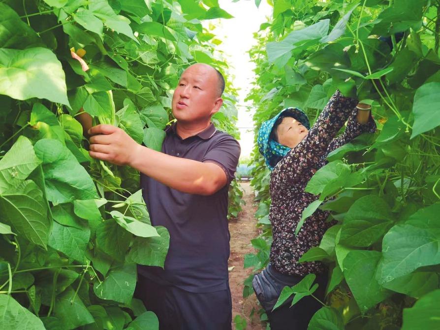 菜农正在蔬菜大棚采摘架豆。(马占富摄)
