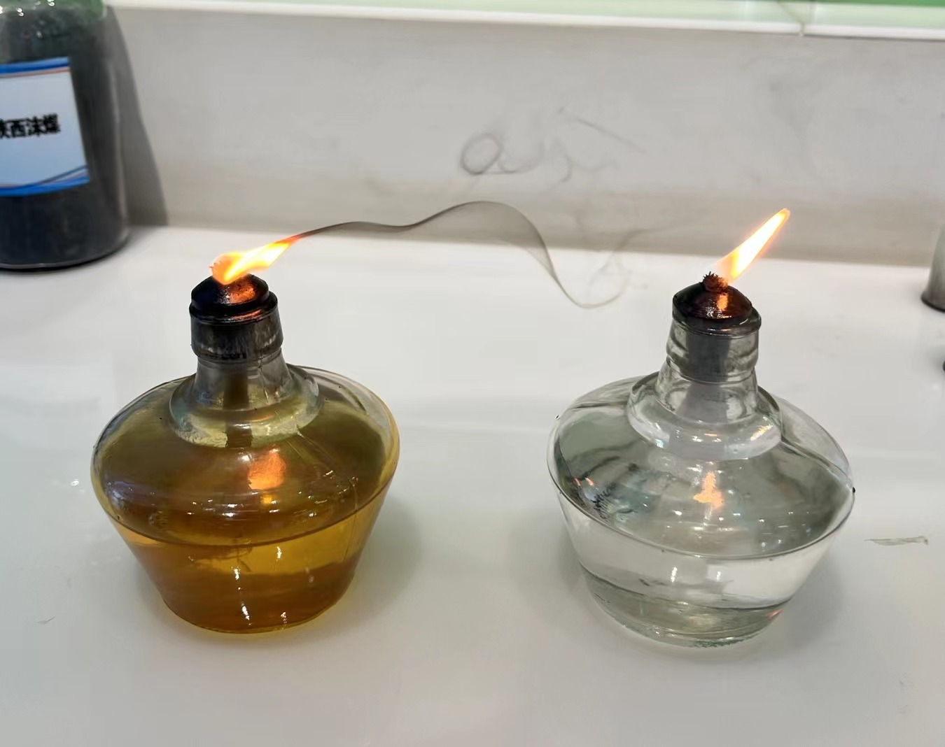 同时点燃的煤制油与石油基油品,石油基油品冒起了黑烟。人民网记者 何晶茹摄