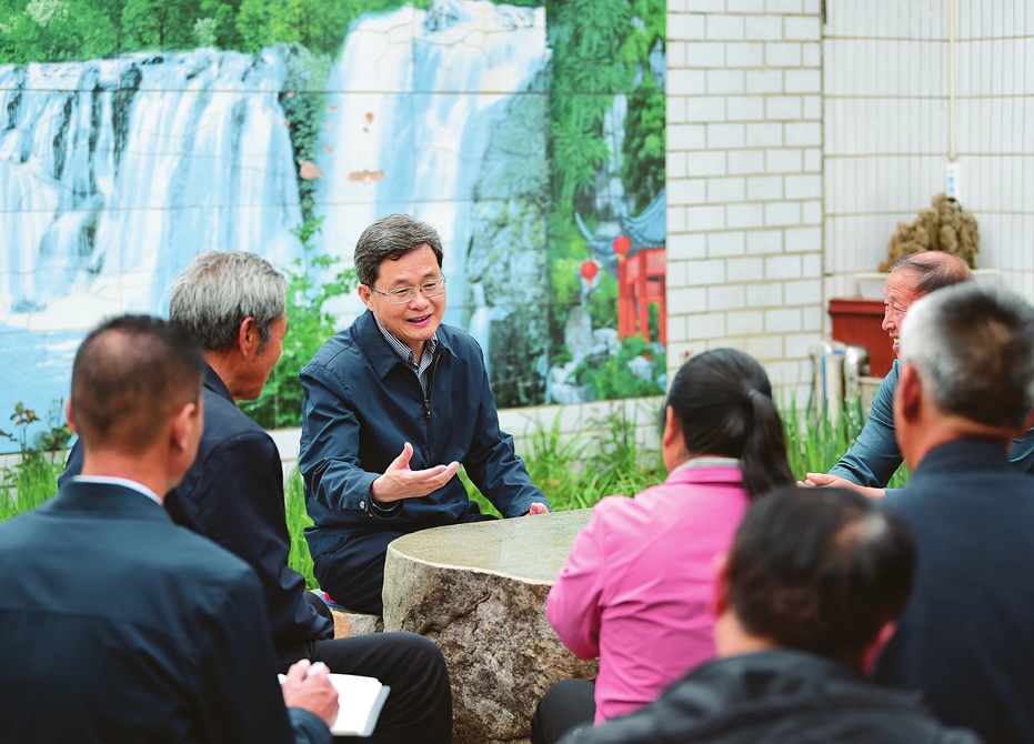 五月九日,省委书记蓝佛安在左权县麻田镇泽城村村民裴云家小院同当地群众和村干部围坐交流。本报记者史晓波摄