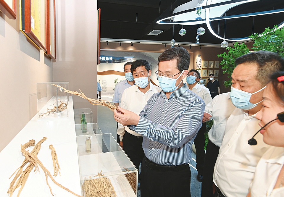 6月15日,省委书记蓝佛安在平顺县上党中药材专业镇调研潞党参等中药材种植加工、产品研发、品牌打造等情况。(史晓波摄)