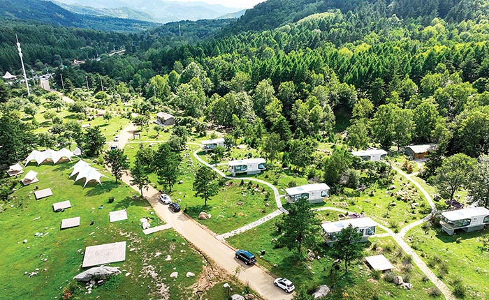 夏末初秋的离石区大东沟,一排排太空舱“镶嵌”在如黛青山间,一辆辆露营车停靠在曲径通幽前,一顶顶帐篷支起“诗和远方”。
