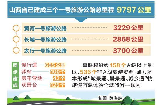 截至今年10月10日,山西省已建成三个一号旅游公路总里程9797公里。其中,黄河一号旅游公路3229公里、长城一号旅游公路2868公里、太行一号旅游公路3700公里,同步建成慢行道685公里、驿站100个、房车营地42个、观景台125个,串联起沿线158个A级以上景区、536个非A级旅游资源(点),基本形成“城景通、景景通、城乡通”快旅慢游深体验全域旅游一张网。